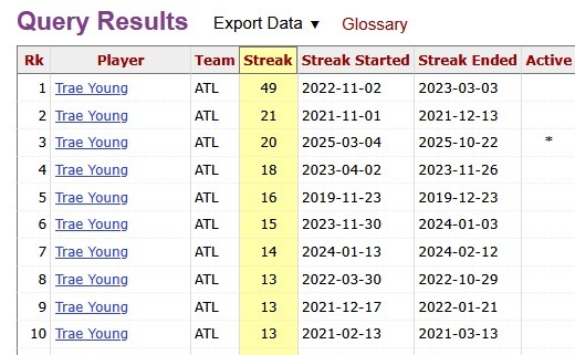 至此,特雷-楊已連續(xù)21場比賽至少砍下15分5助攻,是現(xiàn)役球員之最,也是老鷹隊史并列第2。隊史前10如下: